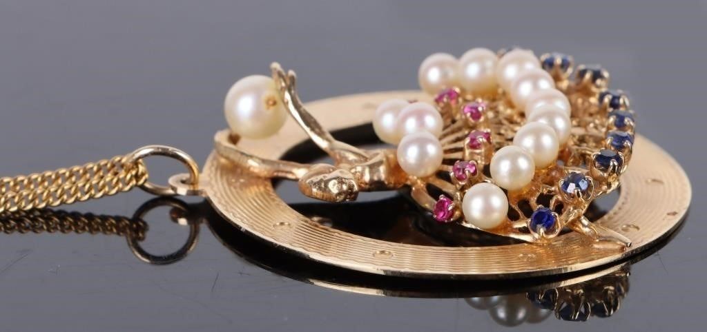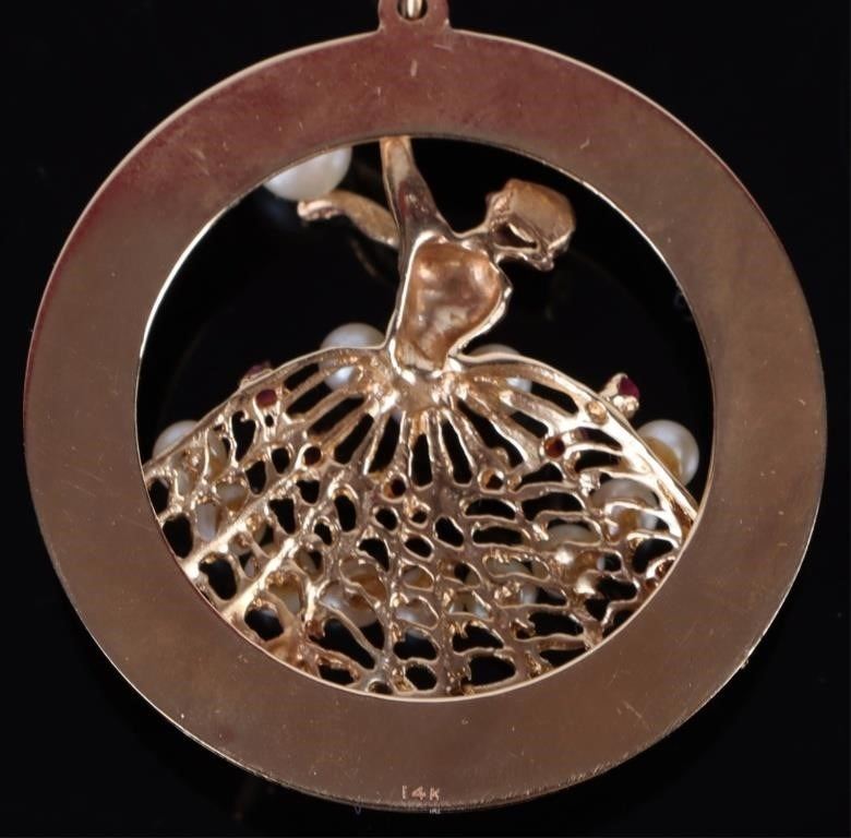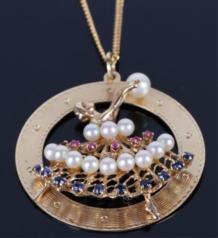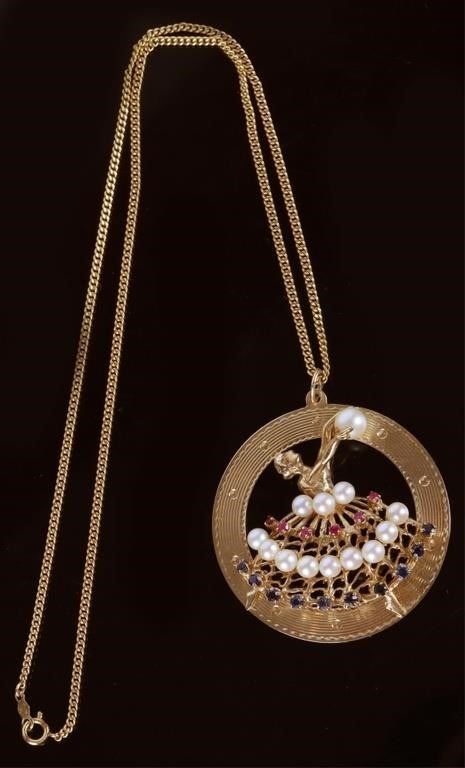 14K. Gold Pearls, Sapphire, & Ruby Ballerina pendant with 10K yellow gold necklace.
