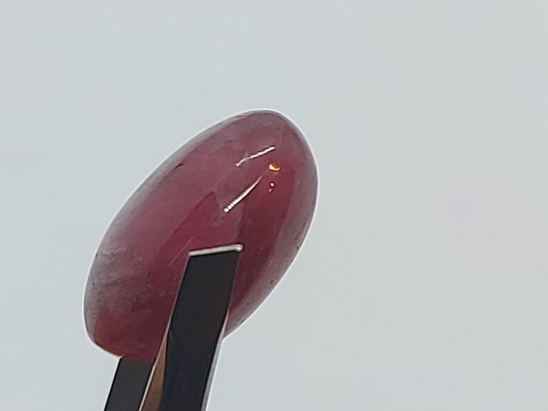 24.88 ct. 14.5 x 17 x 9.3 mm Colour: Cloudy PINKISH RED, Shape: Oval Cabochon, Clarity: Translucent, Luster: Excellent, Origin: Madagascar Treatment: GF