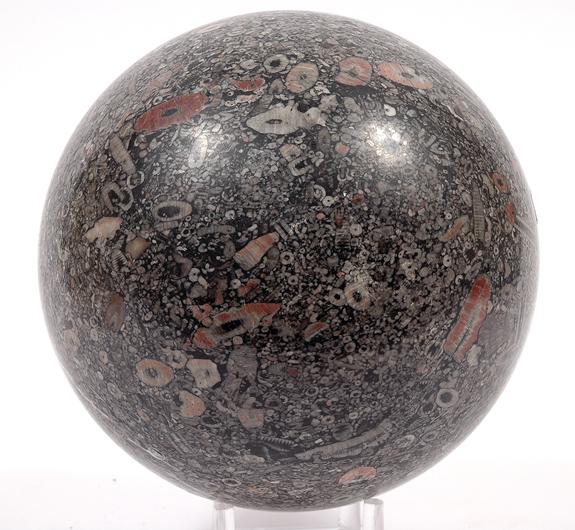 HUGE 26 LB CRINOID SPHERE. This immense 8.5 inch diameter bowling ball size sphere weighs over 26 pounds and is almost composed entirely of hundreds of plates of crinoid stems that are 150 million years old from Henan Province, China. Crinoids are echinoderms, relatives of starfish and are mostly known from the plates that made up their long stems that were attached to the ocean bottom as they filter fed on small organic creatures. These stems easily broke up into the individual round plates when the crinoid died and in some areas comprise 99% of the fossils found in the rocks. The crinoid stems range in shape from straight sections to round and oval and in color from shades of pink to browns and blacks. Because of the rare pink color of some of the stems, this stone is known as pink marble.