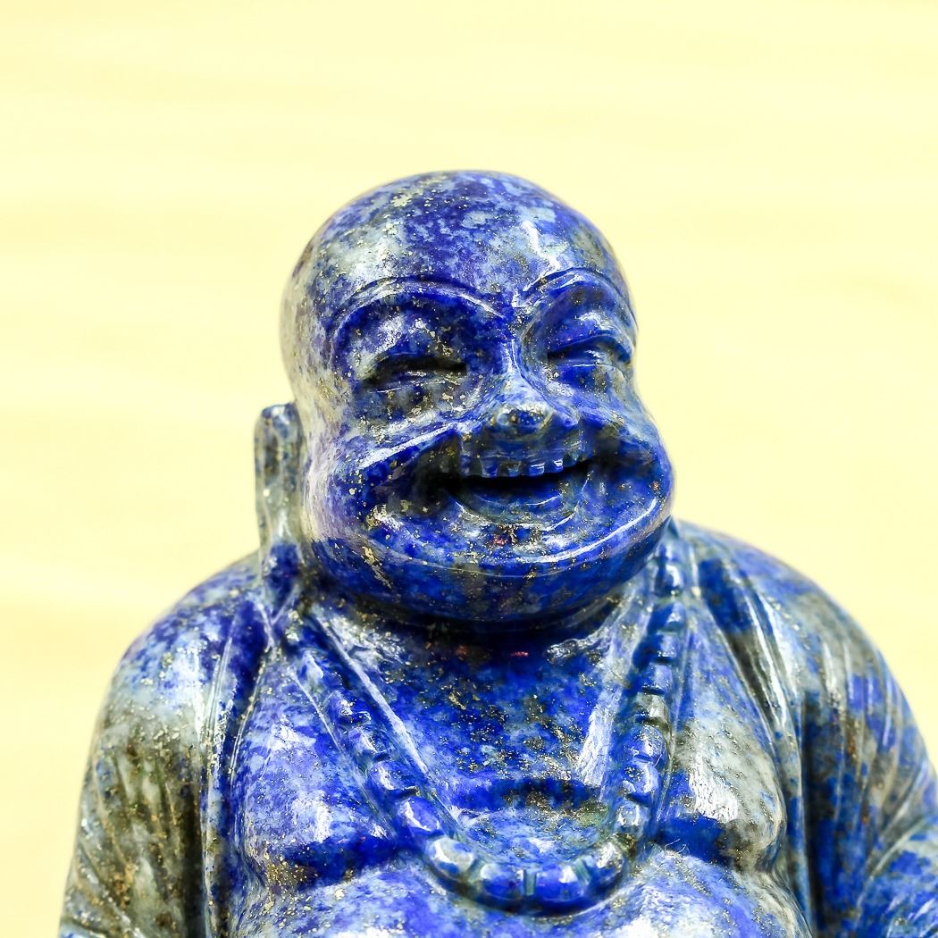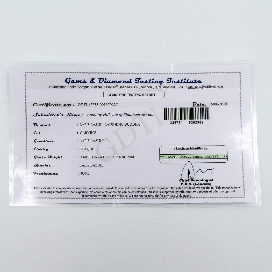 AMAZING RARE MUSEUM SIZE 3060 CT CERTIFIED HAND CARVED BLUE LAPIS LAZULI LAUGHING BUDDHA.UNHEATED 100 % NATURAL NO TREATMENTS.THIS BLUE LAPIS LAZULI HAS THE HIGHLY DESIRED GOLD PYRITE HIGHLIGHTS ARE INCLUDED IN THIS BUDDHA CARVING. BLUE LAPIS LAZULI IS THOUGHT TO STIMULATE THE HIGHER LEVELS OF THE MIND ENCOURAGING CLARITY AND OBJECTIVITY. IT IS ALSO BELIEVED TO ALLOW THE RELEASE OF STRESS BRINGING DEEP INNER PEACE. THIS BEAUTIFUL LAPIS LAZULI BUDDHA MEASURES 82 x 76 x 70 mm. BLUE LAPIS LAZULI IS MOST VALUED FOR IT'S METAPHYSICAL PROPERTIES.WHAT A MAGNIFICANT ADDITION TO ANY ONE'S COLLECTION.