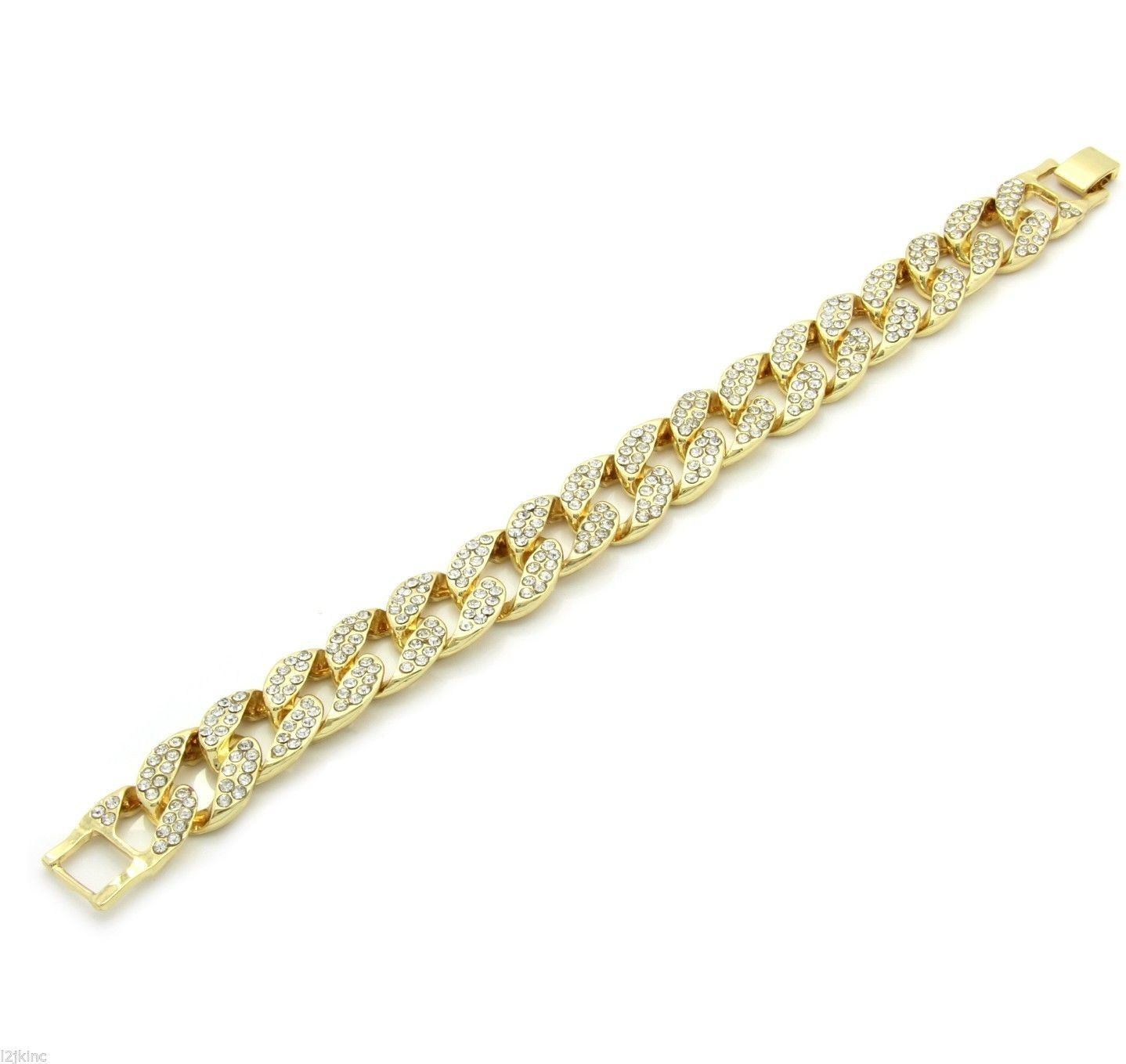 HUGE 35 GRAM 14 KT GOLD PLATED CUBAN LINK BRACELET.Complimented by cz Accent Stones cz Healthy 14 mm. Thick.8 1/2 Long.14 Kt Gold Stamp. Looks Like Solid Gold Without The Solid Gold Price. This Bracelet Is Strong. Total Bling Bling.