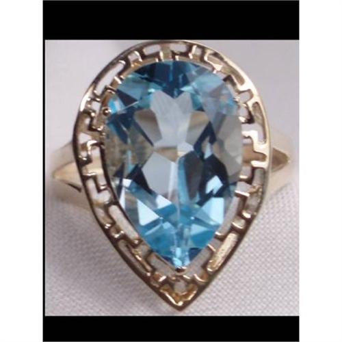 What a GORGEOUS BIG Charmer this is! PURE glitz make up this genuine 3ct blue topaz tear drop 10 kt gold ring. The setting is in a raised Greek key and it is quite large. This is a size 8 and . IN EXCELLENT condition The original price was 250.00 so this is a steal at 195.00.