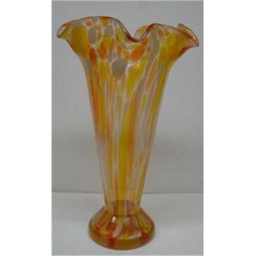 HUGE STUDIO TYPE ART GLASS VASE, MADE OF SPECKLED AND STREATCHED GLAS WITH FRILLS AND DIMPLES ON THE TOP as per images, EXCELLENT CONDITION, It stands 12 1/2" high. US BUYER TO PAY 18.00 FOR SHIPPING PLUS INSURANCE.THANKS.