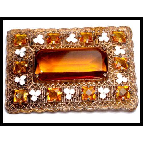 This is the largest enamel brooch I have ever had and it is even prettier than the photos. This one measures 2 1/2? x 1 3/4? and made of an large amount of pierced metal work as well as enameling. THe center topaz colored glass stone is a whopping 1 1/2? long and has beautiful facets. The brooch is heavy and well made and has a gilt over it that goes well with this rich fiery center stone. This is a rare treat so don?t miss out at the last minute