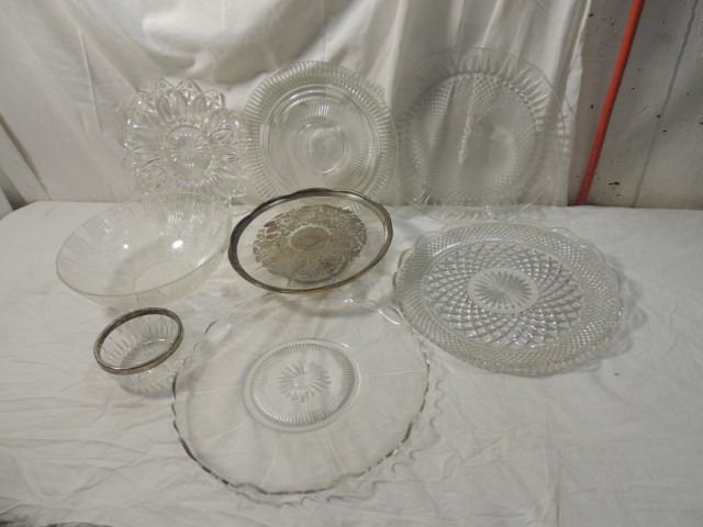 MANY DEPRESSION ERA GLASS SERVING TRAY, SILVER OVERLAY CAKE PLATE, AND MANY OTHER GREAT GLASS SERVING PLATTERS, ETC. AS SHOWN.