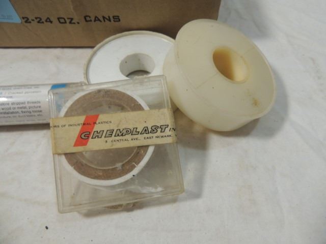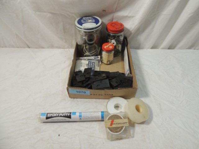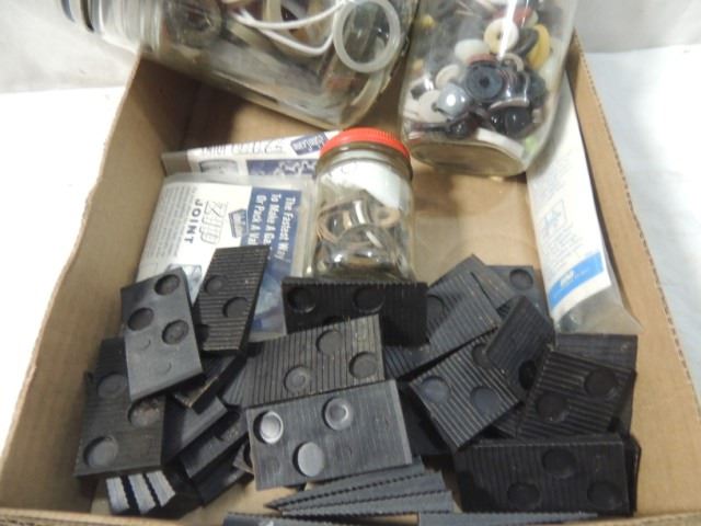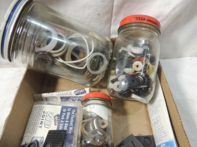 HUGE BOX LOT PLUMBERS WASHERS, PUTTY, FASTENERS, TAPE, AND MORE, AS SHOWN.