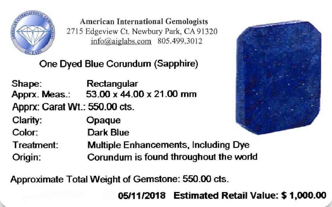 HUGE CERTIFIED 546 CT MUSEUM SIZE BLUE SAPPHIRE. EMERALD CUT MEASURING 53 x 43 x x.20 mm. PLEASE SEE CERTIFICATION FOR FURTHER DETAILS. ONE OF A KIND SHOW PIECE . Total Gram Wt 109.