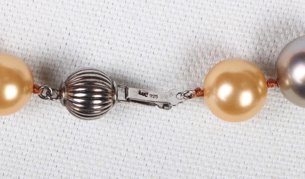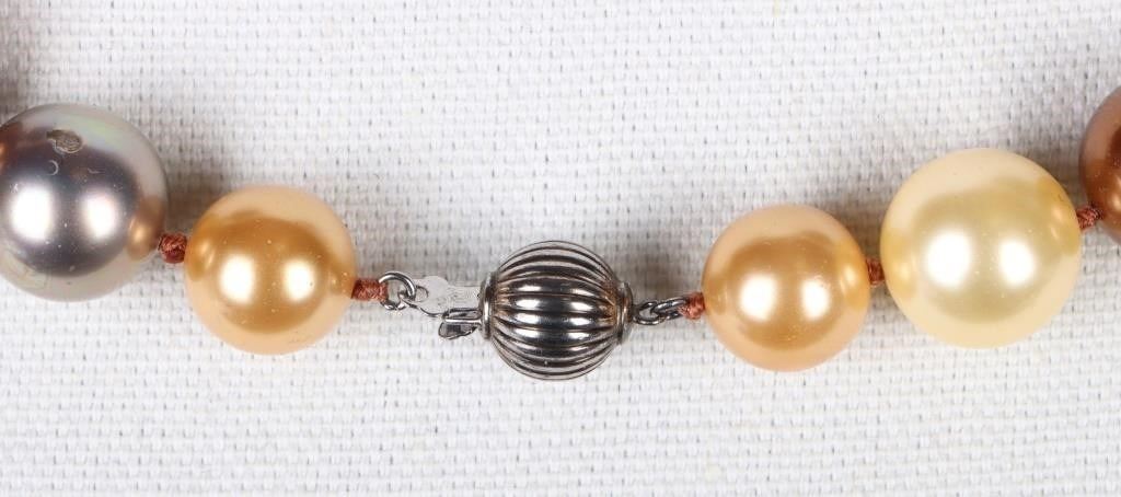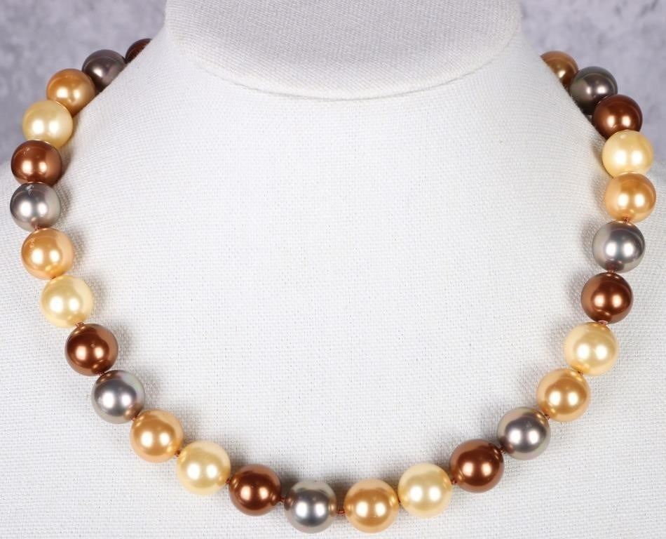 Huge chocolate genuine pearl sterling-clasped necklace with thirty-three pearls colored brown, champagne, silver, and orange. Pearls measure 11.91-14.06mm.
