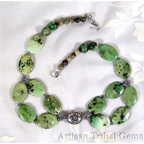 Vera has chosen 30mm chrysoprase nuggets complimented with a 23mm tribal sterling center bead. the necklace is finished off with 14mm round chrysoprase and 8mm turquoise complimented with a 22mm sterling s hook closure. For those not familar to metric 25mm=1".</P>