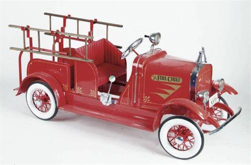 HUGE FIRE CHIEF PEDAL CAR. Professionally restored elaborate fire truck with gold pinstripes and fleur-de-lis corners, padded vinyl seat, white balloon "tires" with black rubber slip-ons, with spoked wheels. Large back end for passenger, wooden ladders, nickel plated dummy search light and headlights, fenders, dashboard decal of odometer, etc., steel bumper, and nickel plated bell. Also features "Fire Chief" decals on both sides of hood and "AFD" license plate. SIZE: 64" l. x 28" h. x 23" w. CONDITION: Near excellent restored condition with slight scratches to paint on fenders. 1-5708 AT