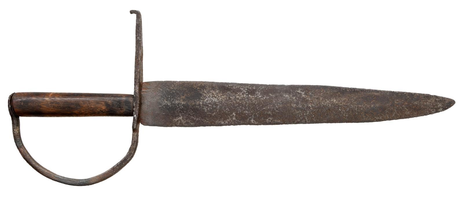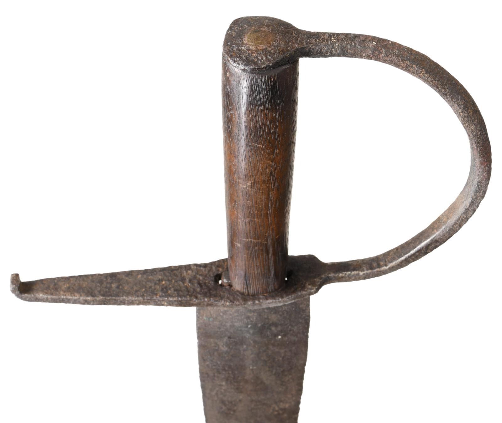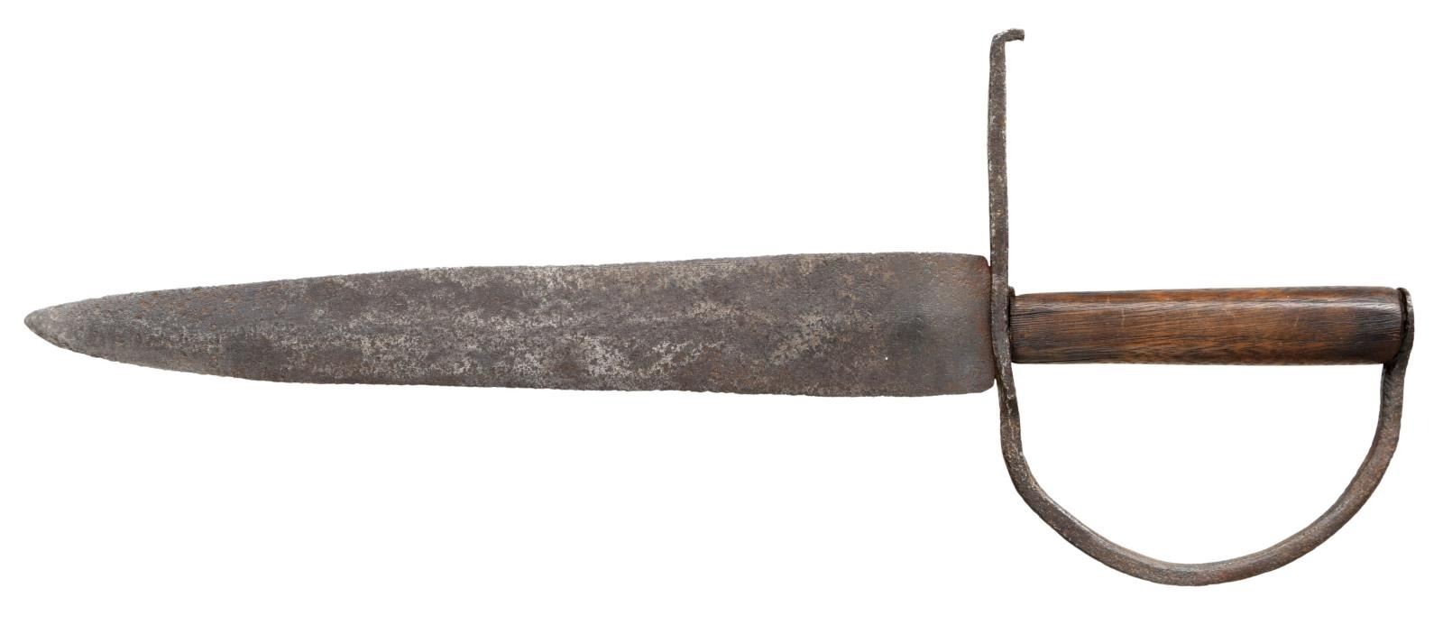 20" overall, 14.25" double edged blade made from file. Massive 8" wide guard. CONDITION: good to very good overall, heavy iron patina with pitting. (02-19081/JS). $700-900.