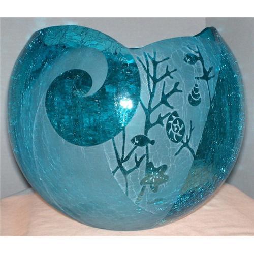 I CHALLENGE YOU TO FIND ANOTHER PIECE LIKE THIS ONE. BEAUTIFUL SEA GREEN CRACKLE GLASS AQUA, HAND MADE, ETCHED AND CARVED WITH AN UNDERSEA DESIGN</em></td>