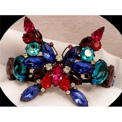 Absolutely STUNNING does not begin to descibe this rich and wide ( 2") butterfly hinge bracelet. The piece looks like it came right out of a Hollywood movie. The 3/4" wide stones wrap all the way around this and each stone is prong set. This is 7" long on the inside. Rich aqua, blues and deep reds are accented with clear and fuchsia stones. IT is one remarkable bracelet. Check out the photo next to the dime and you will see how massive this is.