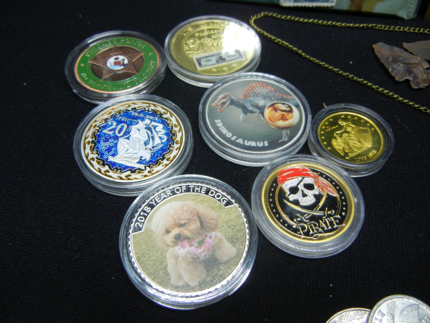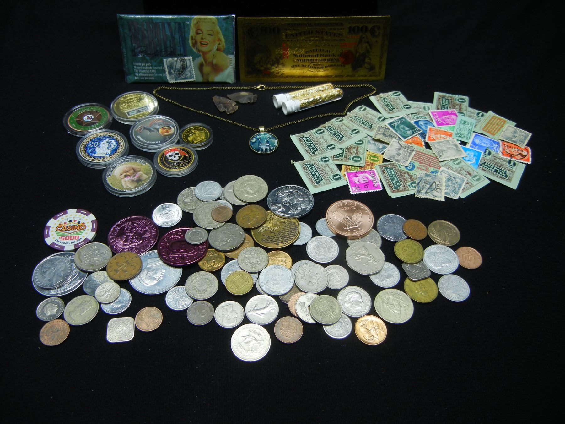 HUGE LOT (21.47 OZ) OF "JUNK DRAWER COLLECTABLES" (SILVER/PROOF TOKENS/VIALS/ARROW HEADS/FOREIGN COINS, MISC.)