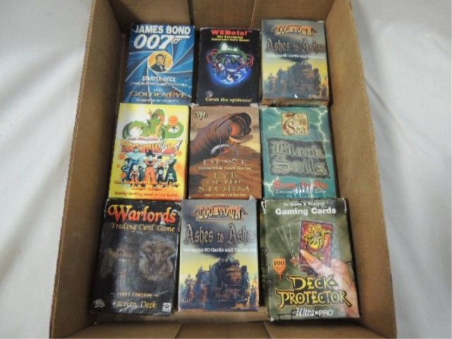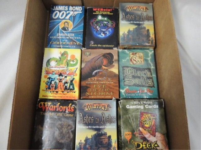 DOOMTOWN, JAMES BOND OO7 GOLDEN EYE, DUNE, WEBOLA, DECK PROTECTOR SLEEVES, WARLORDS, BLACK SAILS DRAGONBALLZ, AND MORE, AS SHOWN.