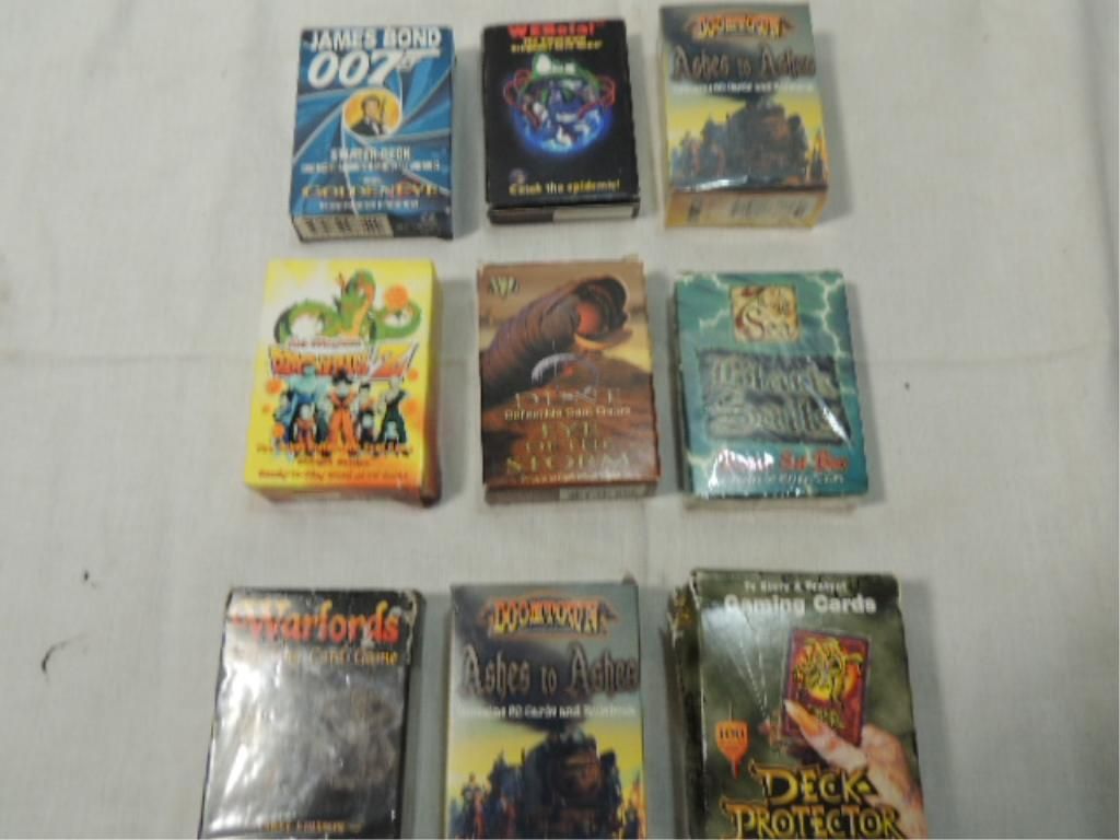 DOOMTOWN, JAMES BOND OO7 GOLDEN EYE, DUNE, WEBOLA, DECK PROTECTOR SLEEVES, FUN COLLECTIBLE CARD GAMES: WARLORDS, BLACK SAILS DRAGONBALLZ, AND MORE, AS SHOWN.