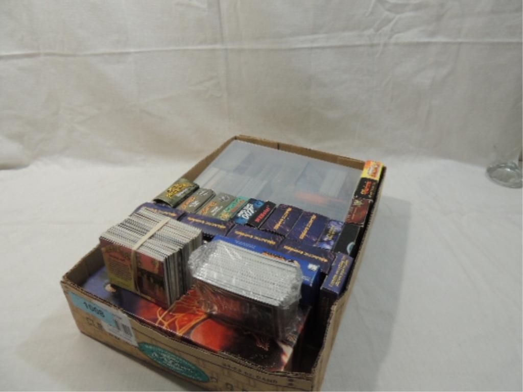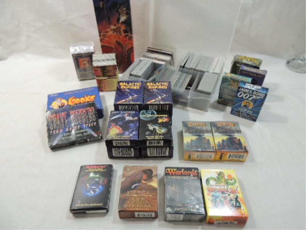EXCITING COLLECTION OF FAST PACED CARD GAMES INCLUDING GALACTIC EMPIRES, GEEKS THE CONVENTION, SPACE EXPLORATION, NEW EMPIRES, ANACHRONISM, GRAVE ROBBERS, DOOMTOWN, JAMES BOND OO7 GOLDEN EYE, DUNE, WEBOLA, DECK PROTECTOR SLEEVES, FUN COLLECTIBLE CARD GAMES: WARLORDS, BLACK SAILS DRAGONBALLZ, AND MORE, AS SHOWN.