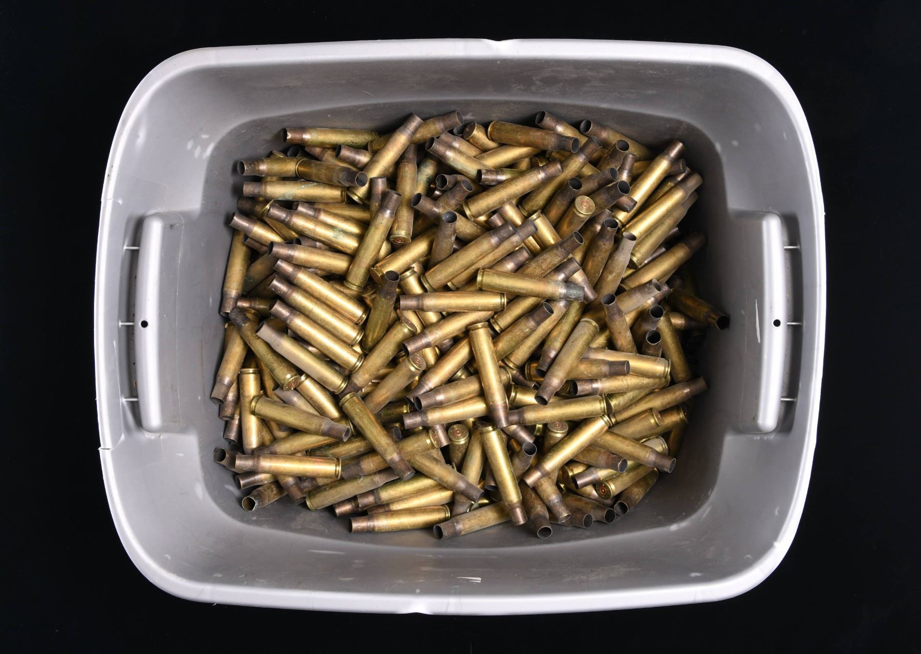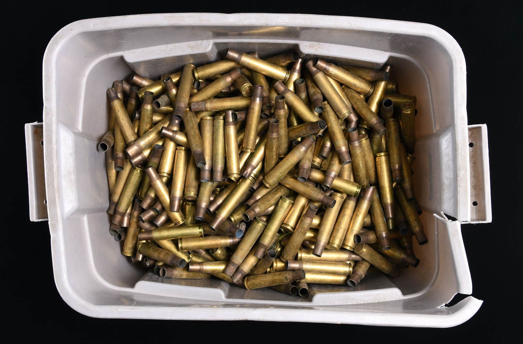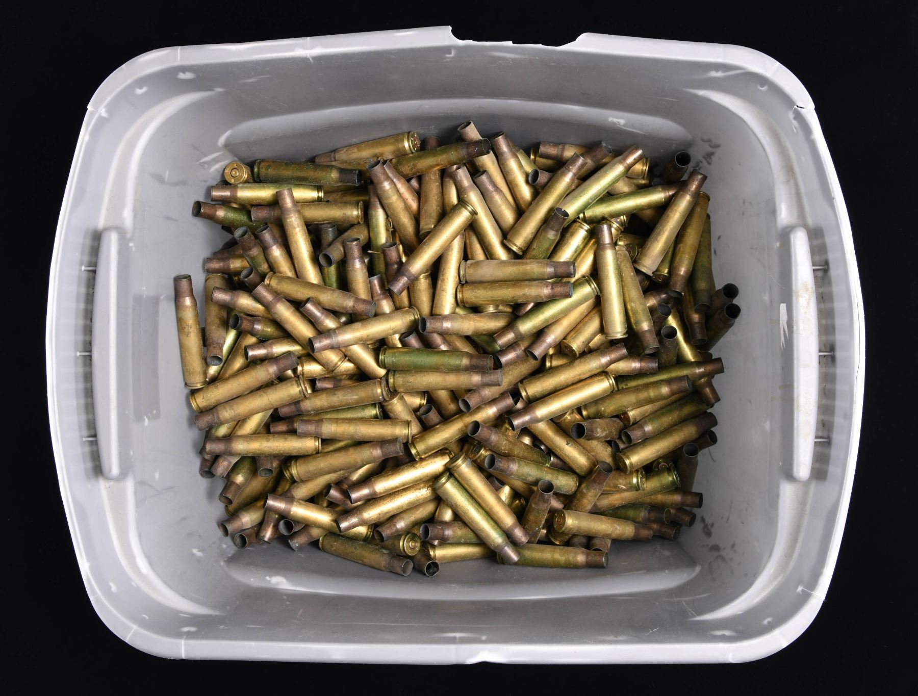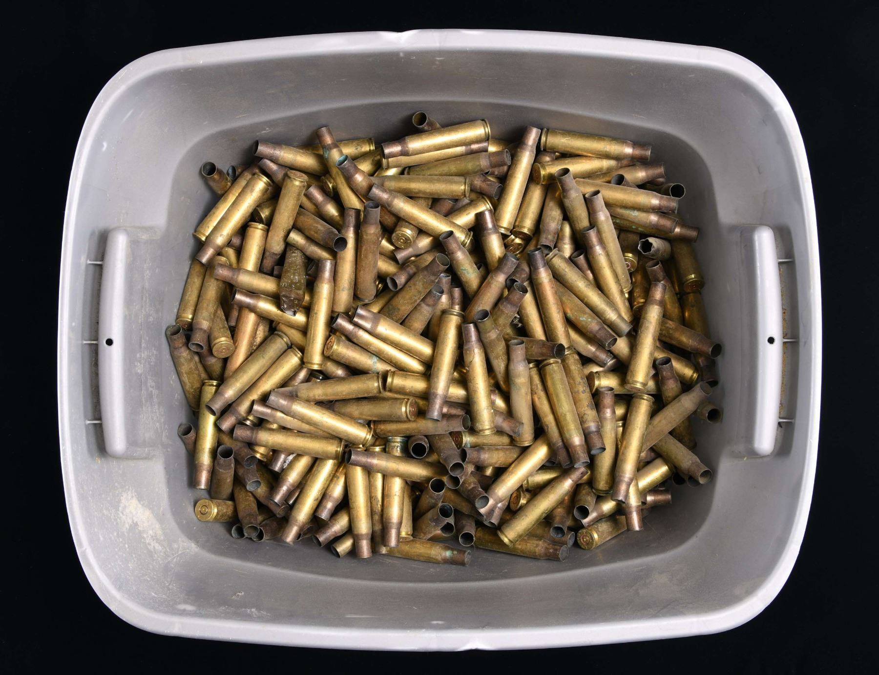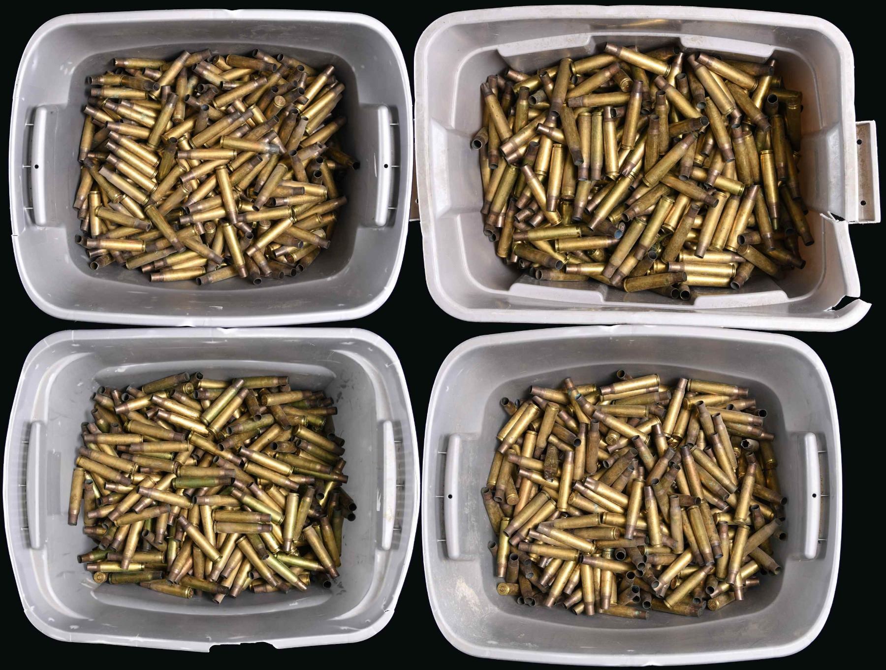 CASES. Huge lot of assorted fired .50 BGM brass cartridge cases in 4 totes. Cases exhibit a variety of headstamps. CONDITION: cases exhibit a dark patina, with some exhibiting areas of verdigris. Most cases are good to very good, with some exhibiting dents, and a small number no longer appearing to be serviceable. PROVENANCE: From the Estate of Ivan Lee Shapiro. (02-23495-25/MLW) $1,000-1,500.