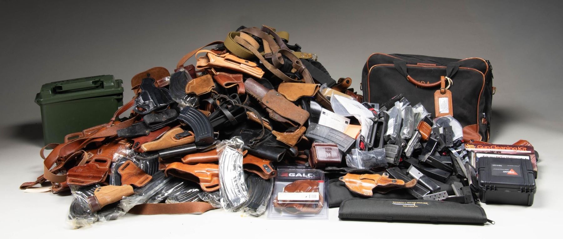 & MAGAZINES. Huge lot of assorted holsters, knife sheaths, and mags., including: 1) Over 100 holsters. Holsters are constructed of leather, polymer, leather & polymer, as well as nylon of various sizes and contours. Some holsters are accompanied by belts with mag. pouches or sliding belt cartridge belts. Some holsters are of WWII and Cold War era mfg., with most being of reproduction. 2) Assorted slings and several stock wraps. 3) approx. 37 knife sheaths from various mfgs. 4) x5 MKE MP5 blued steel 30-rd. mags. 5) x20 AC-Unity MP5 black polymer 30-rd. mags. 6) x13 Croatian AK 7.62x39mm blued steel 30-rd. mags. 7) x9 assorted rifle mags. 8) 44 assorted pistol mags. 9) x4 assorted grip sets. 10) other small accessories. CONDITION: holsters and sheaths are good, showing some scattered marks from handling and storage, with some exhibiting varying degrees of wear from use. Mags. are good with scattered superficial handling marks. (02-25178/MLW). NON-GUN. $1,500-3,000.