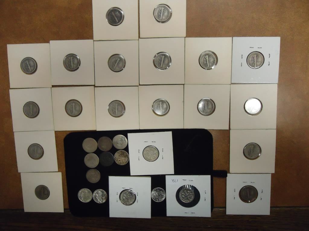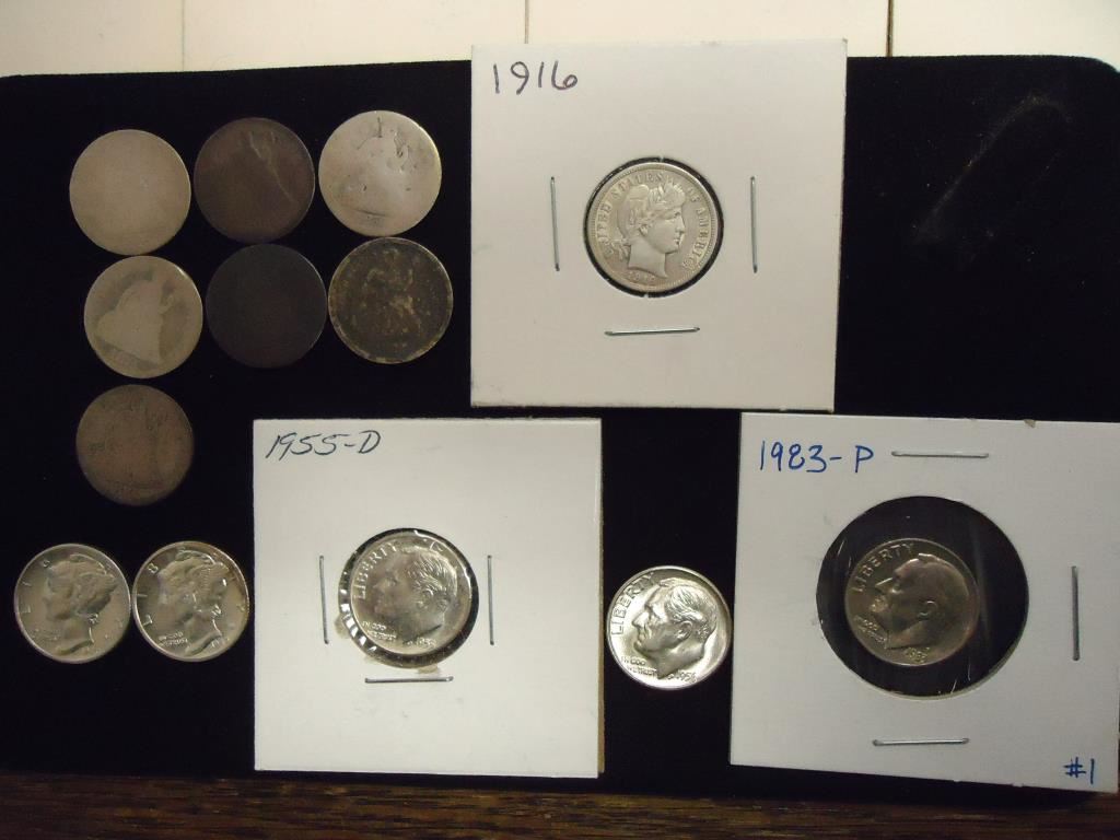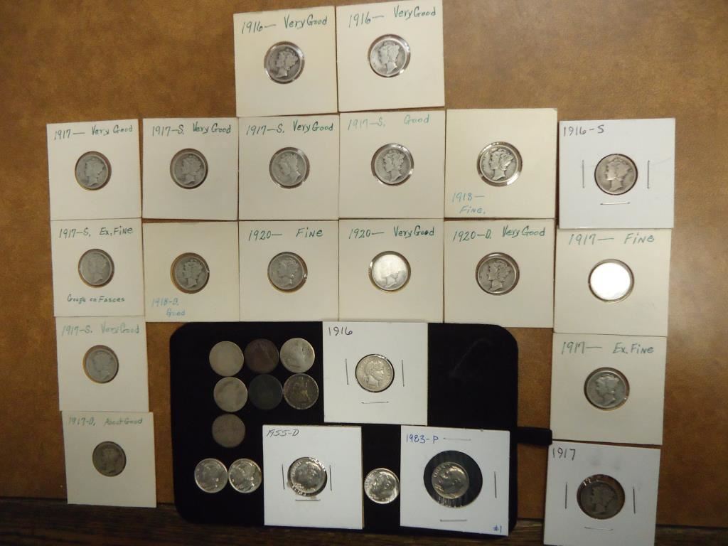 7 ASSORTED SEATED LIBERTY DIMES FROM  1840'S-1880'S, 1916 BARBER DIME EXTRA FINE,   2-1916, 1916-S, 4-1917, 1917-D, 5-1917-S,  1918, 1918-D, 2-1920, 1920-D, 1940 & 1942-D  MERCURY DIMES, 1955-D & 1956 SILVER ROOSEVELT