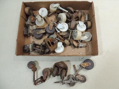 HUGE LOT OF VINTAGE FURNITURE CABINET CASTORS. WOOD & METAL WHEELS. AS SHOWN. VIEW PICTURE FOR DETAIL.
