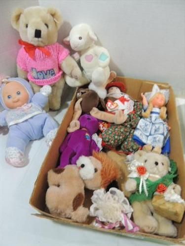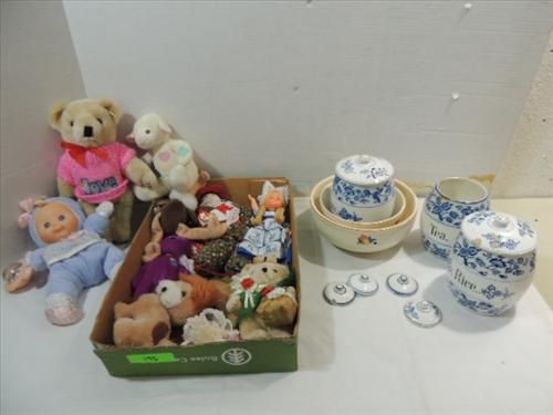 HUGE LOT VINTAGE CERAMIC (3) CANNISTERS TWO WITH LIDS. (PEAS, TEA, RICE) SOME CONDITIONAL ISSUES & 2 NESTED MIXING BOWLS, ASSORTED PLUSH TOYS: TY BEANIE BABY, TEDDY BEARS AND MORE. AS SHOWN. VIEW PICTURE FOR DETAIL.