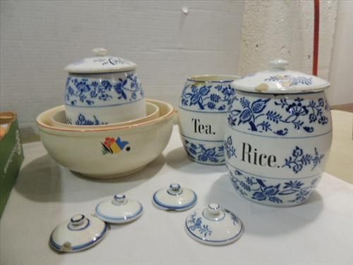 HUGE LOT VINTAGE CERAMIC CANNISTERS & BOWLS, PLUSH