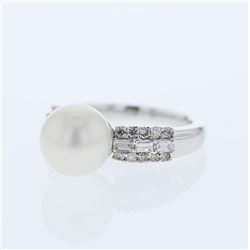 One 18KT White Gold 6.96ct Pearl and Diamond Ring. (1) White Pearl with a total weight of 6.96cts. (26) Diamonds with a total weight of 0.66cts with a