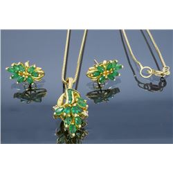 14KT Yellow Gold Emerald and Diamond Earrings and Pendant with Chain