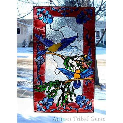 Two bluebirds chattering to each other amid the brilliant green foliage. Complimentary textures coupled with a rich burgandy border make this window a sure winner. Complex detail illustrate to perfect the fabulous technique of stained glass painting. Measuring 15.25 x 26" and as with all my paintings this is presented on a 1/8" acrylic panel, signed and dated complete with heavy chain and hooks.