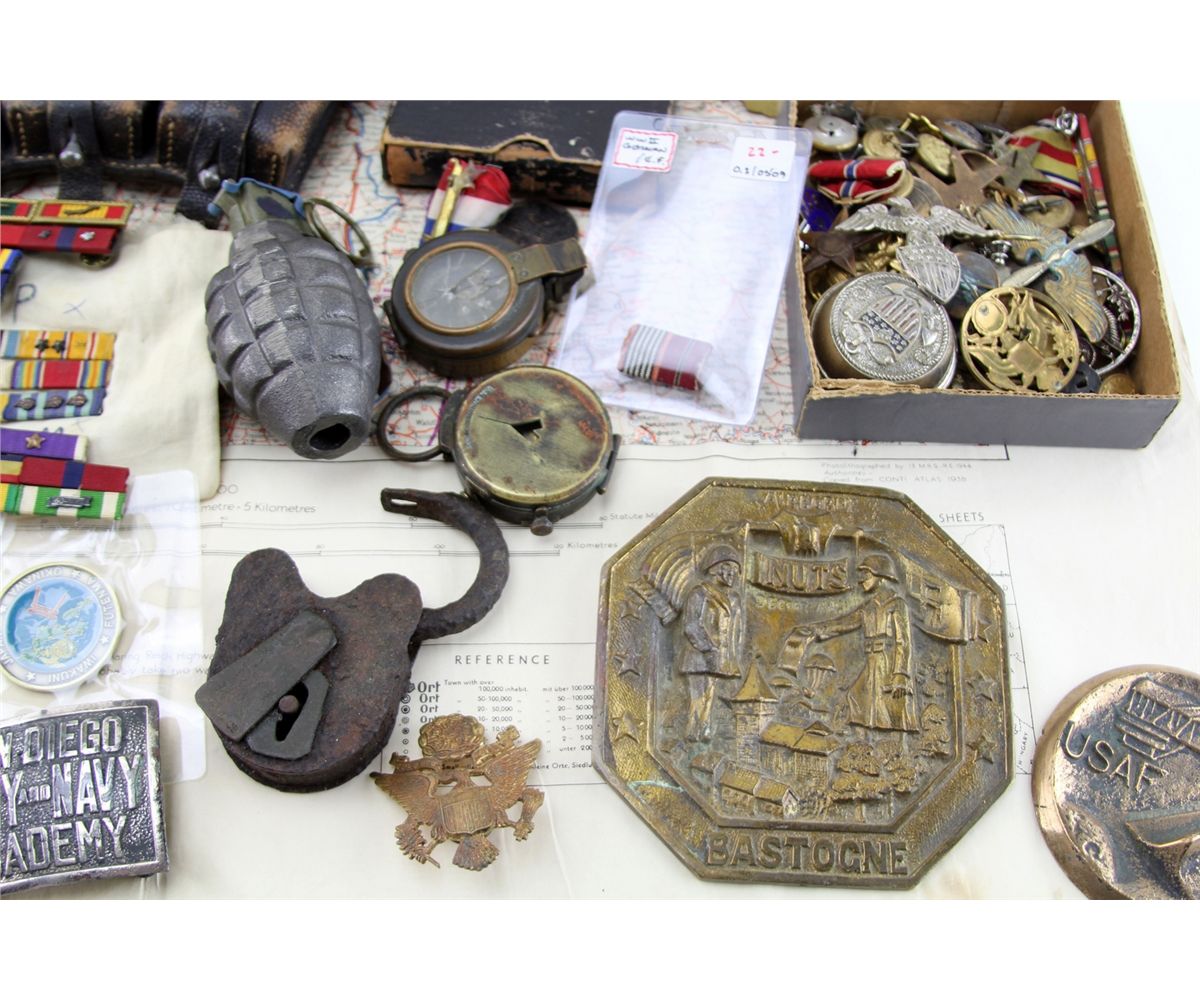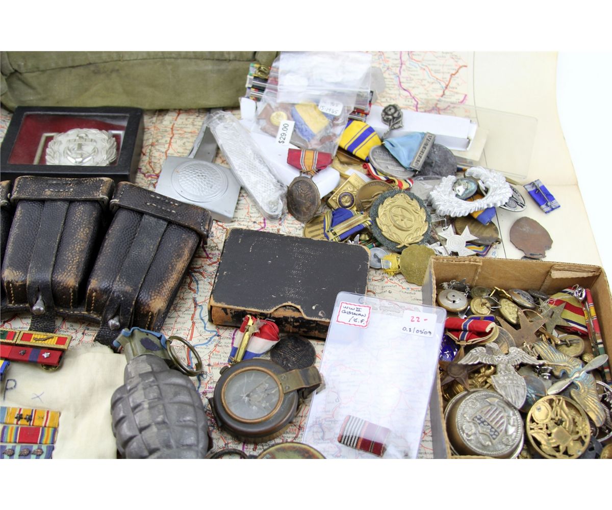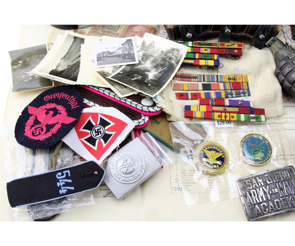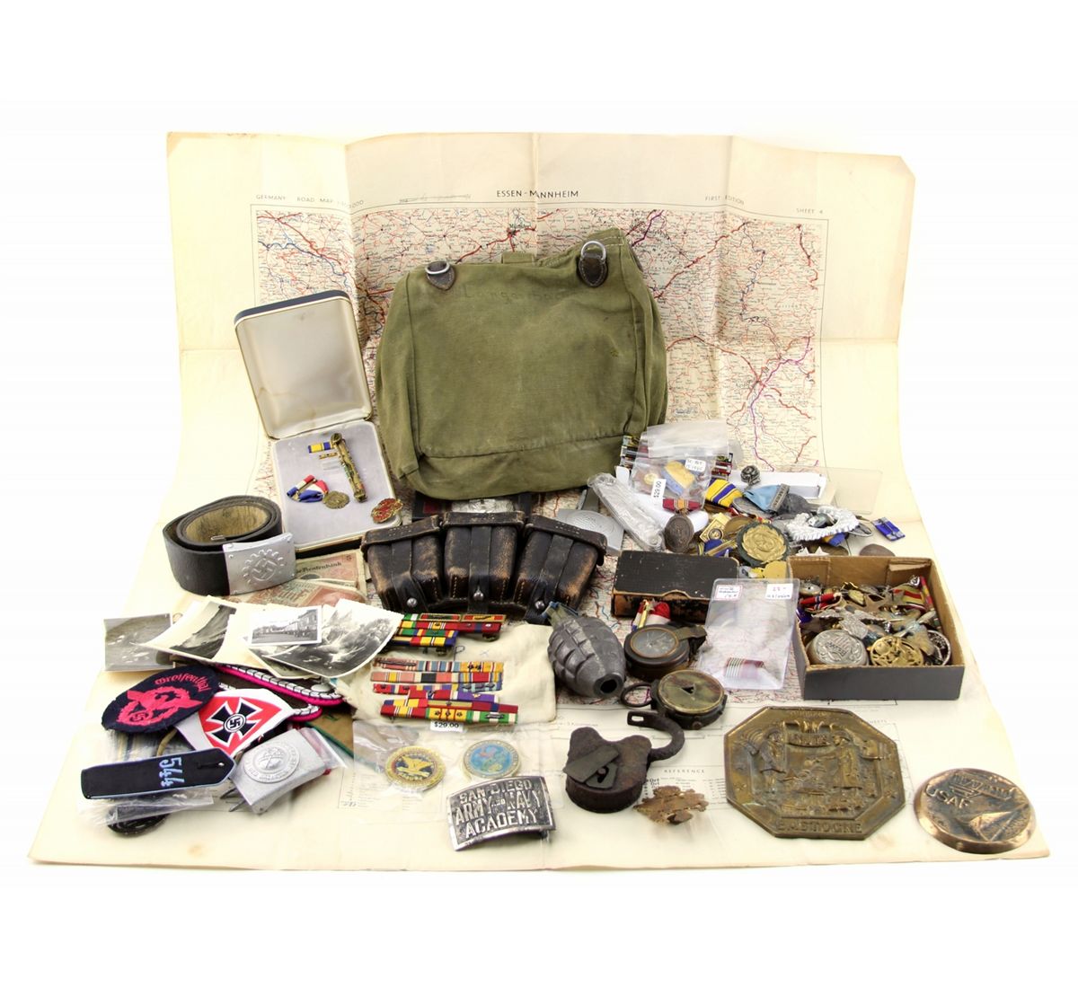 HUGE MILITARIA BONANZA LOT MULTI CONFLICT Mixed militaria lot with huge variety of items spanning multiple countries and 20th Century conflicts. Many WWII era US and German items, as well as letters, currency, gear, medals, insignia, maps, compasses, ephemera, and much more. Country: Mixed Condition: Various conditions