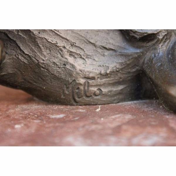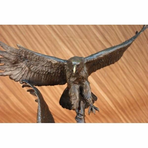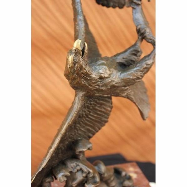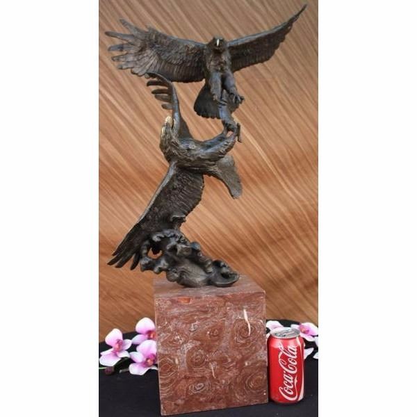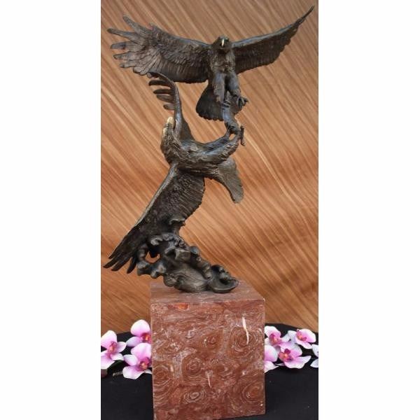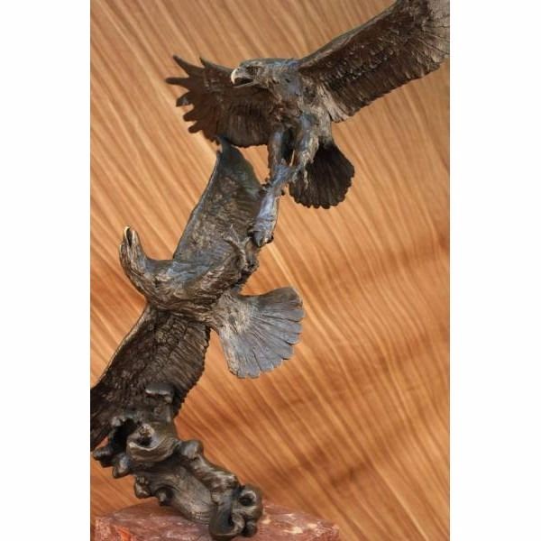 This is a magnificent sculpture and the detail is just incredible. As you can see in the pictures this is actually twoeagles fighting over a fish.The beaks and talons are all done in a very highly polished bronze. This is one of our most popular wildlife sculptures. This bronze statue measures 31" high by 17" long. It is handmade and cast in the traditional Lost Wax Casting Process. This insures a quality bronze sculpture that may be passed down from generation to generation. This is a good piece for outdoor gardens, an entry way, or a great room. This piece will last forever outdoors. It is made to stand up to the elements and will look great wherever you put it with little or no maintenance and is signed by artist Milo. Condition: This sculpture is in perfect condition. Bronze Dimensions with Marble Base:Height 31" x Width 17" Marble Dimensions: 7 1/2" X 7". Height without base: 23 " Weight : 40 LBS Inventory 54K20118045