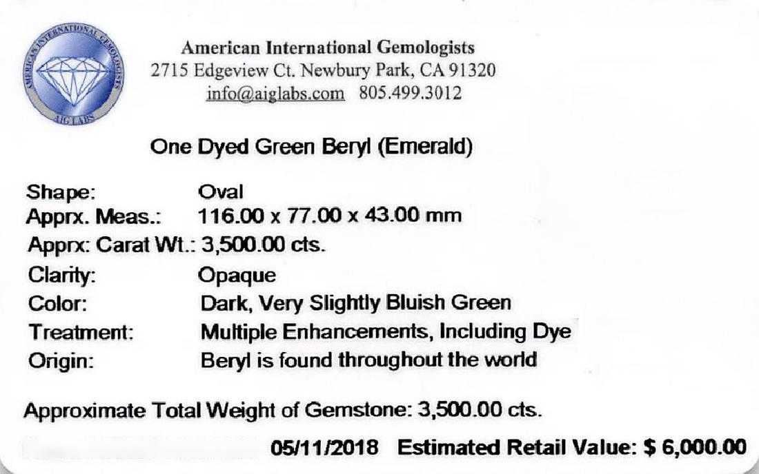 LEGENDARY RARE DOUBLE CERTIFIED HUGE 3,500 CT MUSEUM SIZE EMERALD. OVAL CUT MEASURING 116 mm x 77 mm x 43 mm. A ONE OF A KIND SHOW PIECE . DON'T PASS THIS ONE UP.