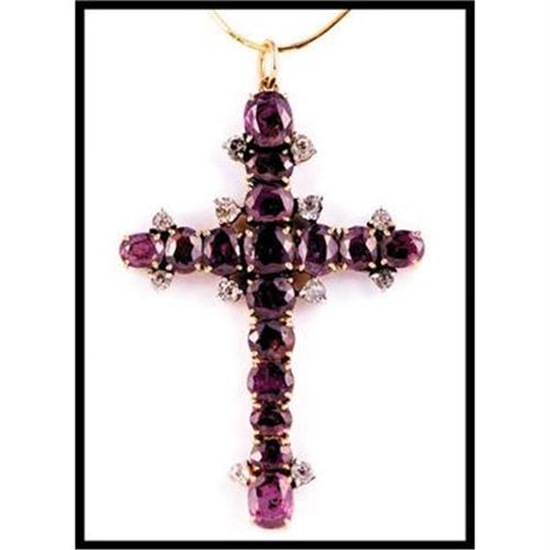 Over 7 ½ carats of natural rubies are set in this 18K solid gold cross (7.9 grams) with 12 old mine cut diamonds (2/3 carats t.w.). It measures 51mm x 32mm (2" x 1 ¼"). It was priced for almost $3,000.00. Though rubies are deep color, and included, the look is wonderful. The price is sensational!! No chain.