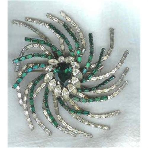 4" X 4". Three layered brooch. The back layer is clear rhinestones, the middle layer is green rhinestones and the top layer is a large green stone surrounded by clear stones. The two top layers move. It is marked. "Made in Austria" on the back. The setting appears to be a rhodium plate. No missing stones.