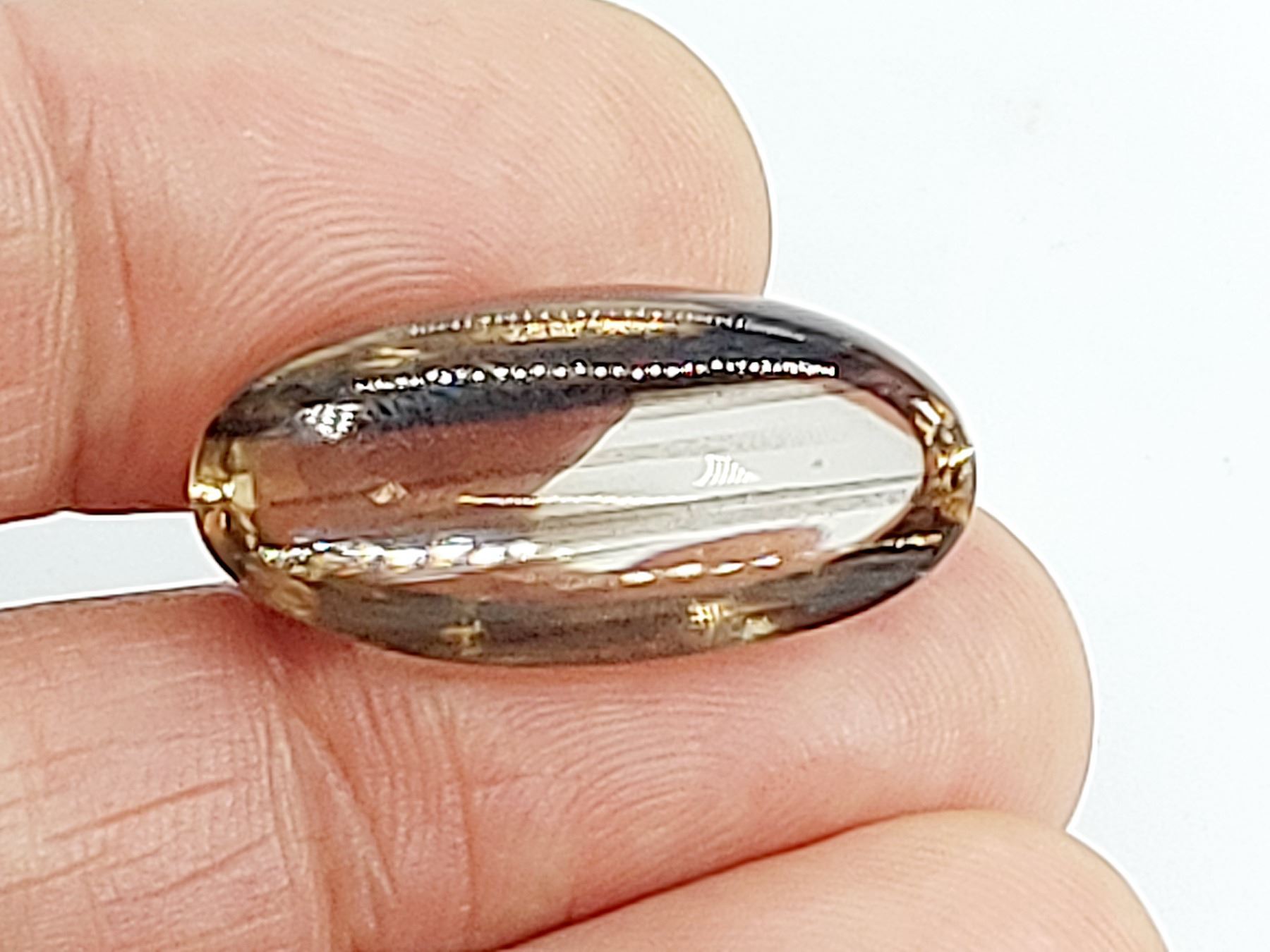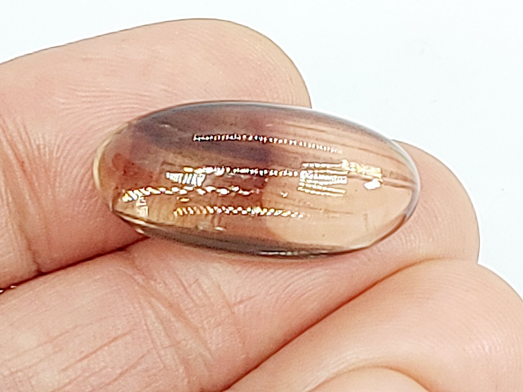 34.97 ct. 28.3 x 14 mm. Colour: Yellowish Brown with Irridescence , Shape: Oval Cabochon , Clarity: Translucent , Luster: Excellent , Origin: India Untreated