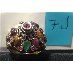 Ring is size 7 , no missing stones, multi stones, different shapes, no stamp white bezels and yellow shank.