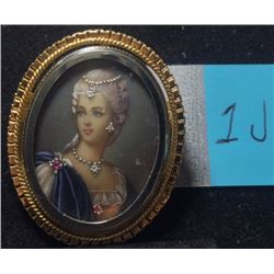 Brooch has 2 stamps that reads 269AL and the second 750, they are in the bail, it can be used as a pin or a pendant. The pic is hand painted and ha