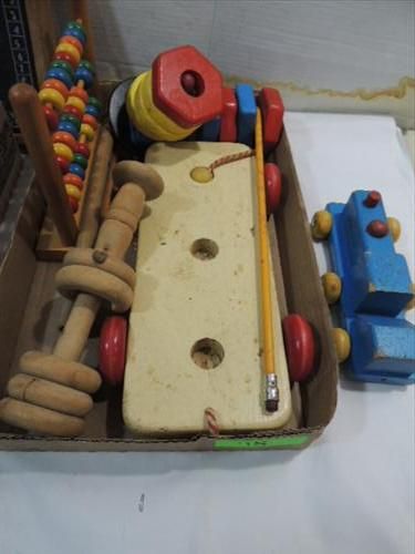 HUGE SELECTION VINTAGE ALL WOOD TOYS: PEGS, RINGS, PULL TOYS AND MUCH MORE. AS SHOWN. VIEW PICTURE FOR DETAIL.