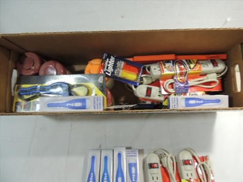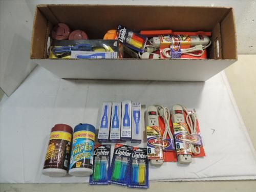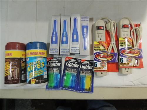 HUGE SUPPLY LOT: 10 SURGE PROTECTORS, 8 PKS CIAGRETTE LIGHTERS, SMALL POCKET FLASH LIGHTS, 11 WOOD & GLASS CLEANER, AND MORE. THIS IS AN EXCELLENT OPPORTUNITY TO STOCK YOUR SHELVES. AS SHOWN. VIEW PICTURE FOR DETAIL.
