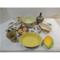 LOT 12 VINTAGE CERAMIC BOWLS & PLATES: 1 HALL #701 SERVING PLATTER, HALL KITCHENWARE MIXING BOWL, SHAWNEE PLANTER AND MUCH MORE. AS SHOWN. VIE...
