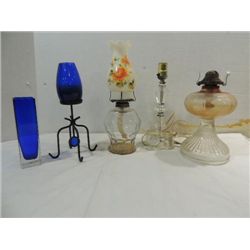 LOT 5 ASSORTED VINTAGE COLLECTIBLES: 2 KEROSENE LAMPS, 2 COBALT BLUE GLASS CANDLE HOLDERS AND 1 PRESS GLASS SIDE TABLE ELECTRIC LIGHT. AS SHOWN. VIE