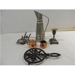 LOT 6 VINTAGE FOREIGN MADE METAL ITEMS: NORWEGIAN SYRUP PITCHER, SWEDISH PEWTER CANDLE HOLDER, SWEDISH COPPER SOUVENIR AND CAST IRON TRIVET. AS SHOWN