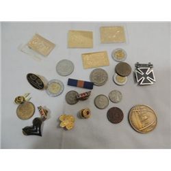 LOT 13 (9) FOREIGN COINS & 4 GOLD FOIL US POSTAGE STAMPS, LAPEL PINS: MILITARY, GIRL SCOUTS & MORE. AS SHOWN. VIEW PICTURE FOR DETAIL.