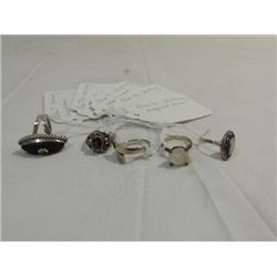 LOT 5 STERLING SILVER RINGS, GARNET, WEDGEWOOD, SHELL, WOOD STONES. AS SHOWN. VIEW PICTURE FOR DETAIL.