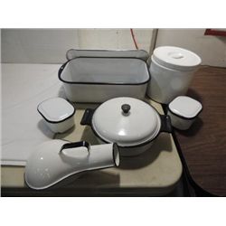 LOT 6 VINTAGE ENAMALWARE: 3 LIDDED SPECIMEN TRAYS, CANNISTER, LIDDED COOK PAN. AS SHOWN. VIEW PICTURE FOR DETAIL.
