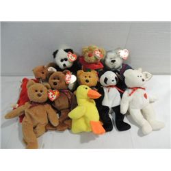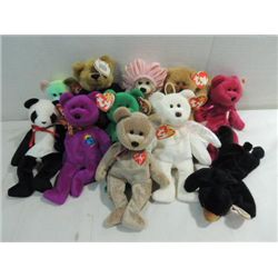 LOT 11 1990S PLUSH BEANIE BABIES: TEDDY, VALENTINO, SNORT AND MORE. AS SHOWN. VIEW PICTURE FOR DETAIL.