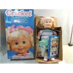 PLAYMATES 25" CRICKET TALKING VINYL DOLL. INLCUDES 30 MINUTE CASSETTE. IN ORIGINAL BOX. AS SHOWN. VIEW PICTURE FOR DETAIL.