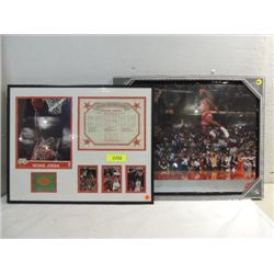 LOT 2 20X16 FRAMED MICHAEL JORDAN PHOTOS & LIFETIME STATS. CLASSIC IMAGES OF MICHAEL'S PERFORMANCE. AS SHOWN. VIEW PICTURE FOR DETAIL.