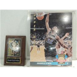 LOT 2 SHAQUILLE O'NEAL COLLECTIBLE: OVERSIDE UPPER DECK CARD & BASKETBALL CARD ON SMALL PLAQUE. AS SHOWN. VIEW PICTURE FOR DETAIL.